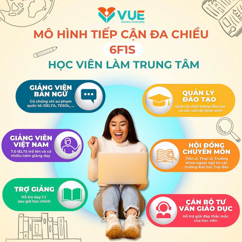 VicUni tự hào là đơn vị tiên phong tại Việt Nam áp dụng mô hình 6F1S – “6 kèm 1”, trong đó mỗi học viên không chỉ có một giáo viên, mà là cả một đội ngũ 6 người đồng hành xuyên suốt hành trình học tập. Đây là mô hình được VicUni xây dựng dựa trên triết lý: “Không ai bị bỏ lại phía sau, dù học online hay offline.”